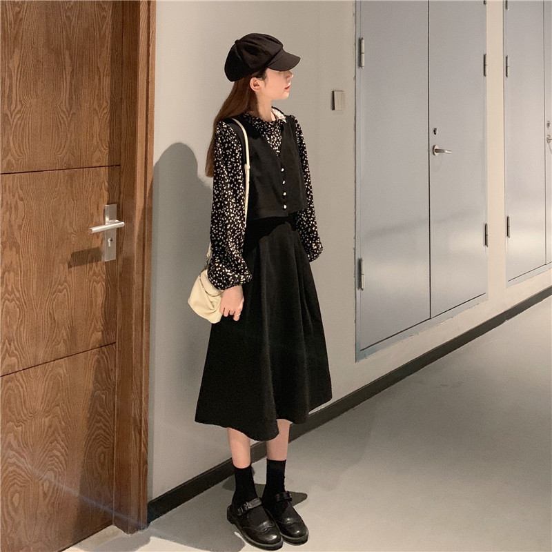 2023 Retro Kukkaommel Fake Kaksiosainen Mekko Naisten Vakosametti Vyötärö