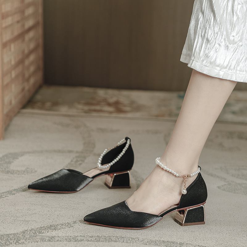 Baotou Sandaalit Naisten Keskikorkoiset Teräväkärkiset Kesä 2023 Uudet Korkeakorkoiset Kengät Paksukorkoiset Helmiäiskengät