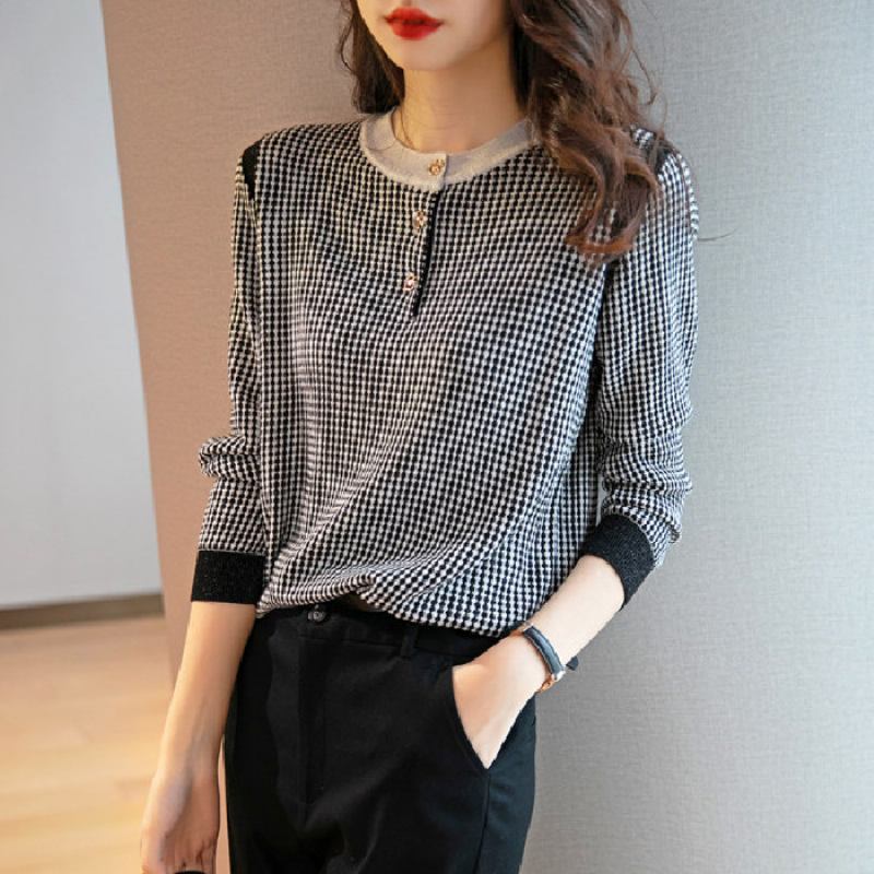 Länsimainen Löysäpohjainen Naisten Toppi 2023 Kevään Ja Syksyn Uusi Pyöreä Pääntie Pitkähihainen Mustavalkoinen Ruudullinen Neulepusero Tide