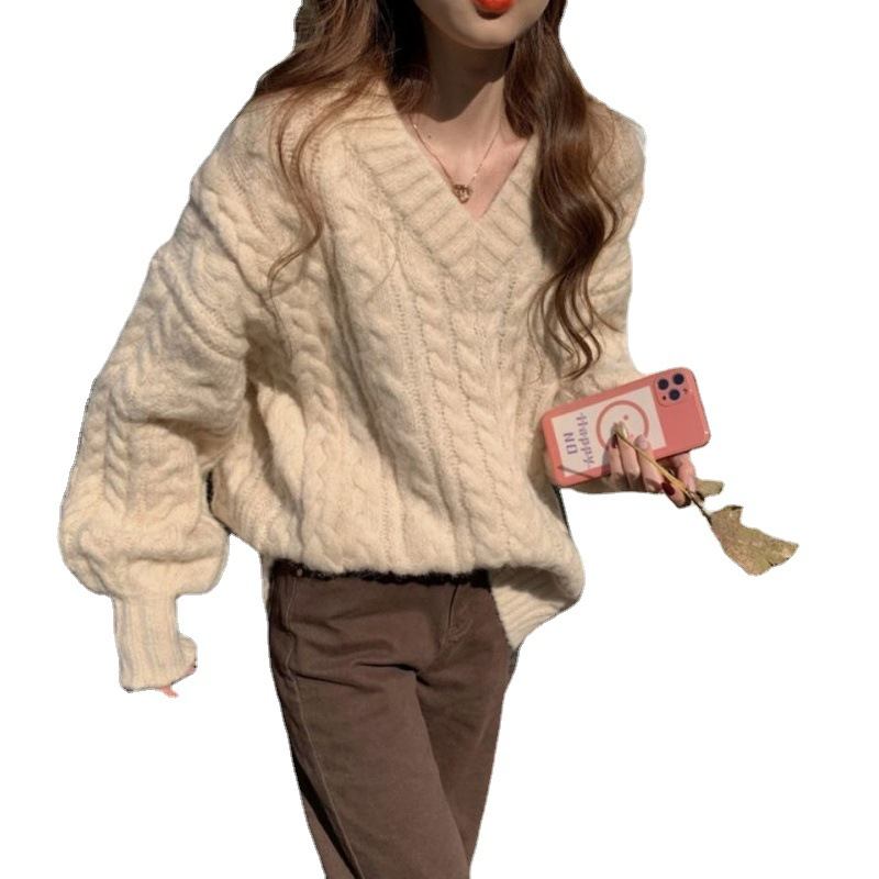 Naisten Pehmeä Sininen V-kaula-aukkoinen Pusero 2023 Uusi Kevään Ja Syksyn Löysä Twist Villapaita Toppi