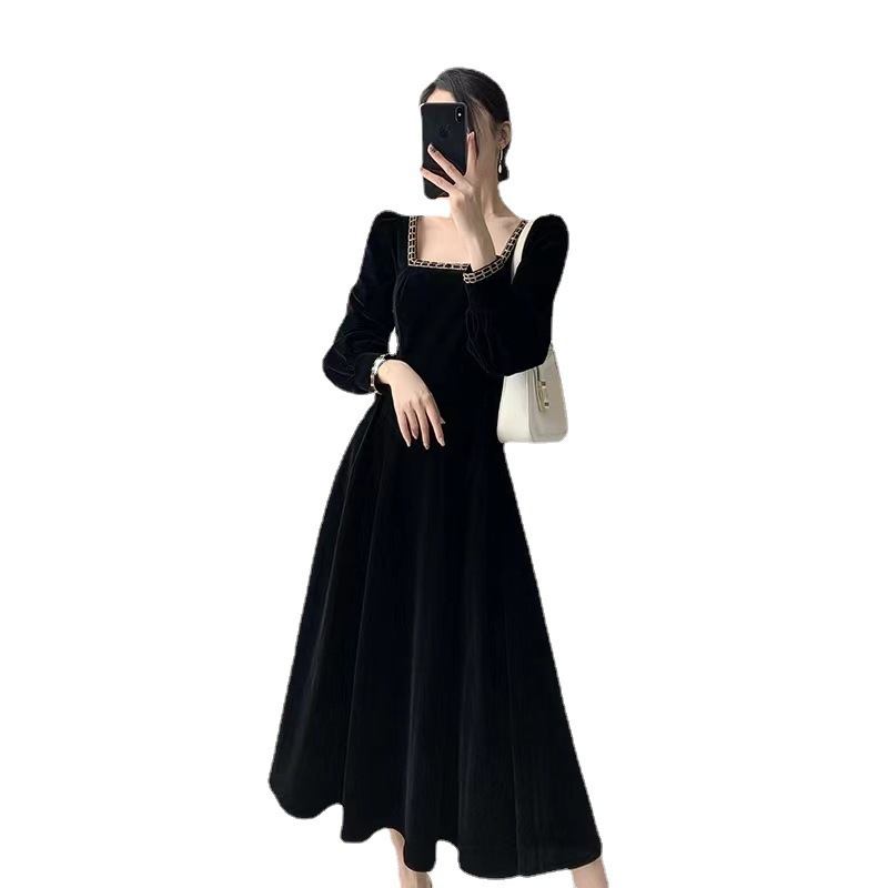 Neliömäinen Kaulus Phnom Penh Samettimekko Naisten Retro Musta Temperamentti Pitkä Hame