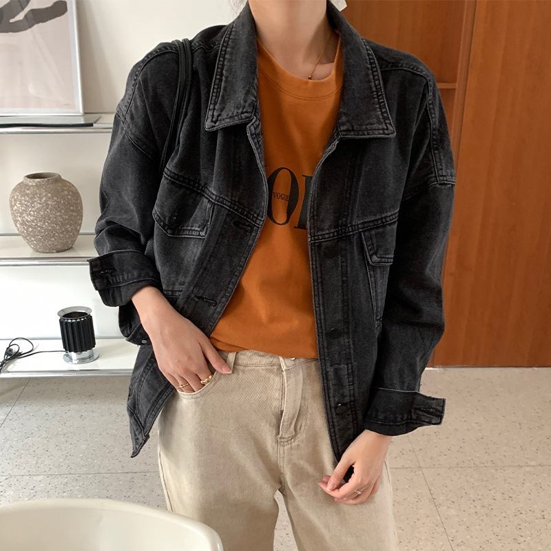Vintage Grey Black Denim Jacket Naisten Pitkähihainen Rintaneuletakki